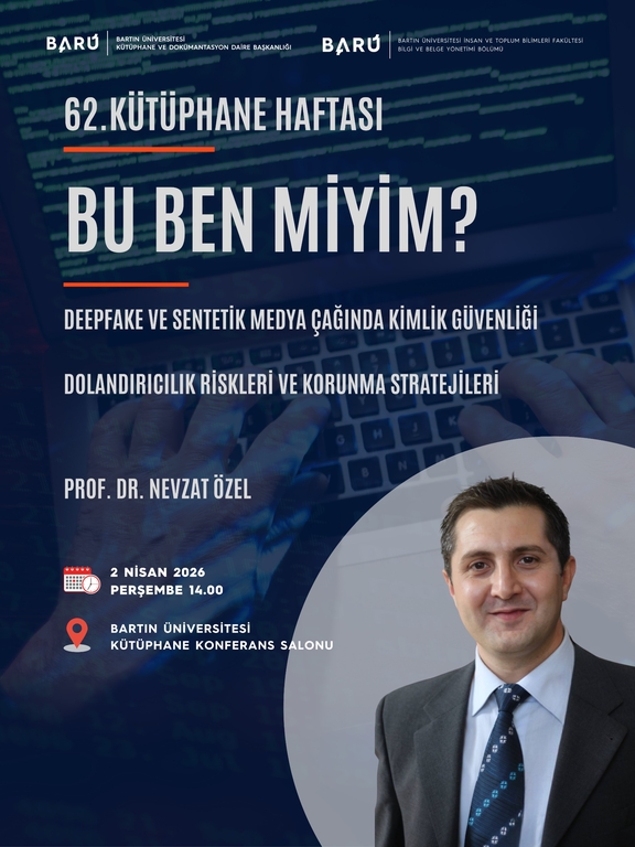 Bartın Üniversitesi Kütüphane ve Dokümantasyon Daire Başkanlığı ile Bilgi ve Belge Yönetimi Bölümü iş birliğiyle 62. Kütüphane Haftası kapsamında düzenlenen “Bu Ben Miyim? Deepfake ve Sentetik Medya Çağında Kimlik Güvenliği, Dolandırıcılık Riskleri ve Korunma Stratejileri” başlıklı etkinliğimize davetlisiniz.
