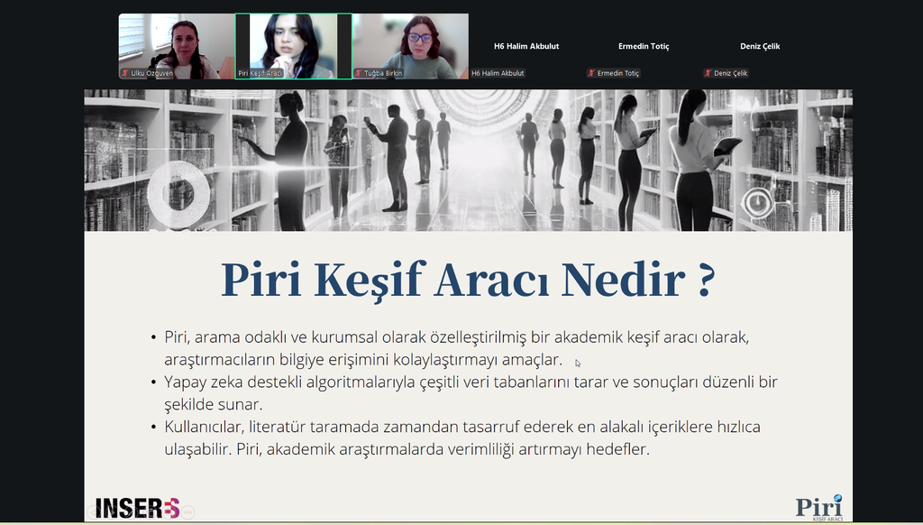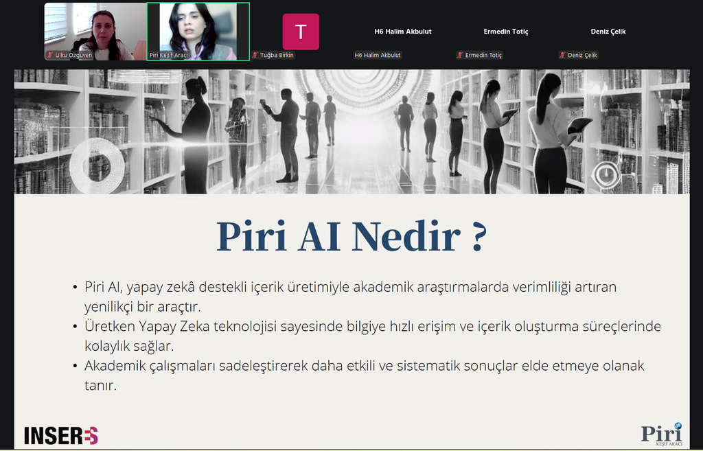 11 Mart 2026 tarihinde çevrim içi ortamda gerçekleştirilen eğitim programında, akademik bilgiye hızlı erişim ve araştırma verimliliğinin artırılmasına yönelik önemli dijital araçlar tanıtılmıştır. Program kapsamında, yerli bir akademik arama motoru olan Piri'nin sunduğu imkânlar ve yapay zekâ entegrasyonu katılımcılara uygulamalı örneklerle aktarılmıştır.