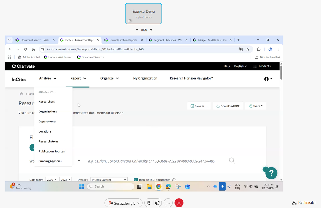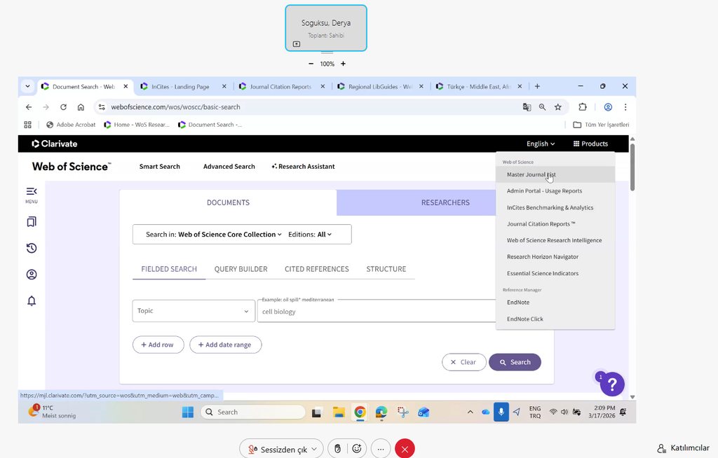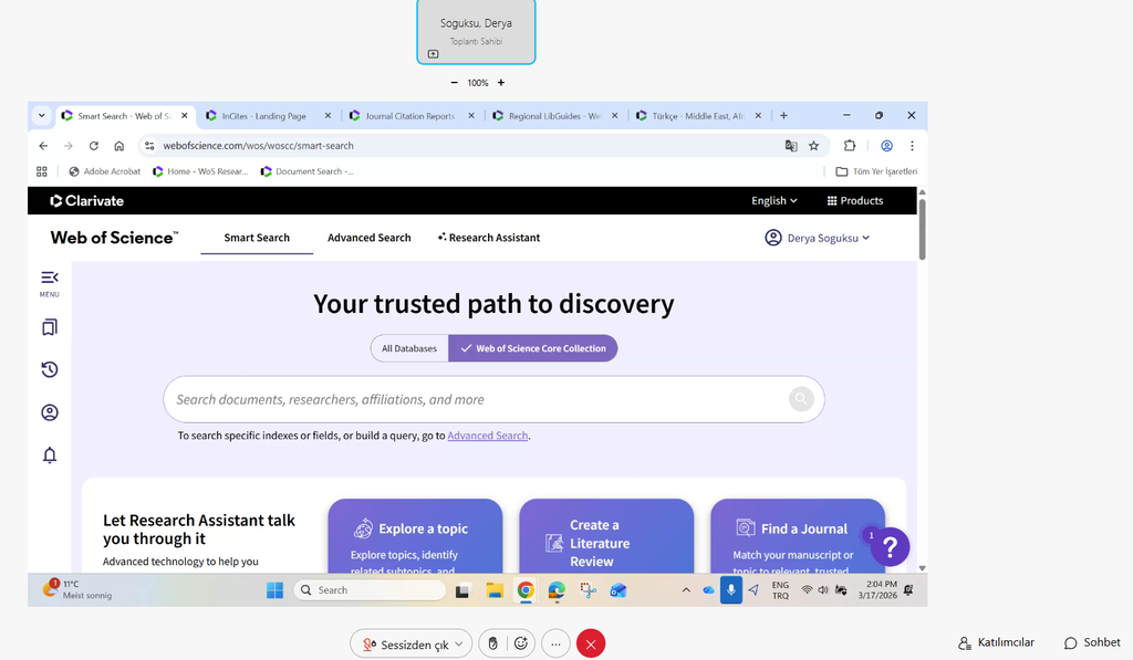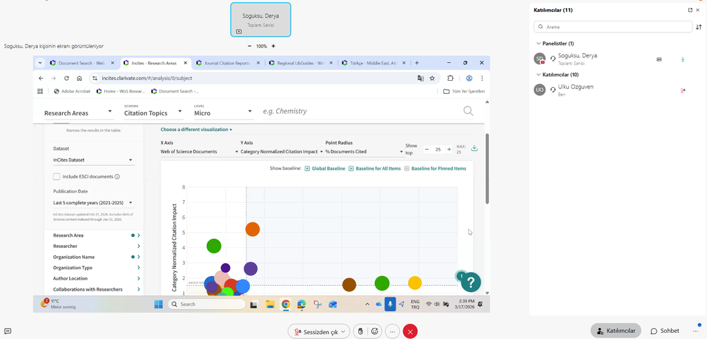 17 Mart 2026 tarihinde çevrim içi ortamda gerçekleştirilen eğitimde, Web of Science Core Collection verilerini temel alan stratejik araştırma değerlendirme platformlarının kullanımı uygulamalı olarak aktarılmıştır.